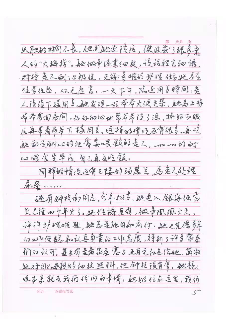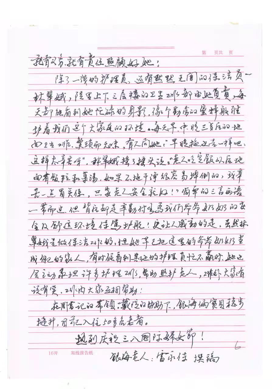 q有钟桂南同志,今年52岁,她进入银俩宝贝已经W四个年头了(jin)。她性格直爽做事风风火火Q许多让人头疼的护理NQ她总能自如应对Q她也凭借多q的工作l验和认真负责的工作态度Q得C(jin)许多家属的认可。甚x老者家属塞?/span>500元钱U包l她Q感Ȁ她对自己母亲的细致照料,但钟桂南没有拿,反而是义正a辞的拒绝?jin)。她_(d)(x)“这本来是我们分内的事情,奶奶住在我们q里Q我们就有义务就有责任要照顾好她Q?/span>
