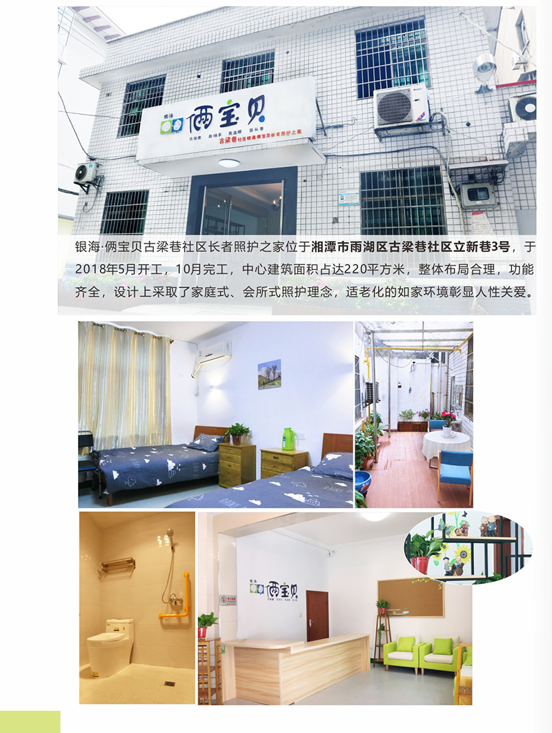 銀?!z寶貝古梁巷社區(qū)長(zhǎng)者照護(hù)之家位于湘潭市雨湖區(qū)古梁巷社區(qū)立新巷3號(hào),于2018年5月開工,10月完工,中心建筑面積占達(dá)220平方米,整體布局合理,功能齊全,設(shè)計(jì)上采取了家庭式、會(huì)所式照護(hù)理念,適老化的如家環(huán)境彰顯人性關(guān)愛。