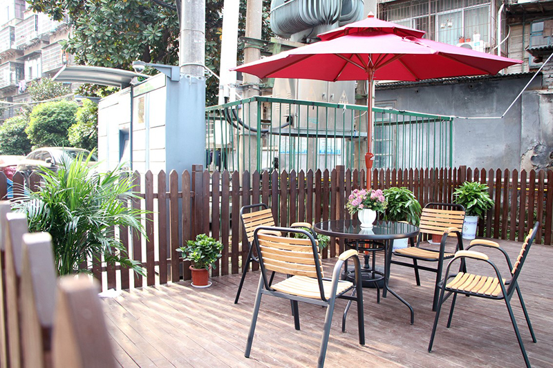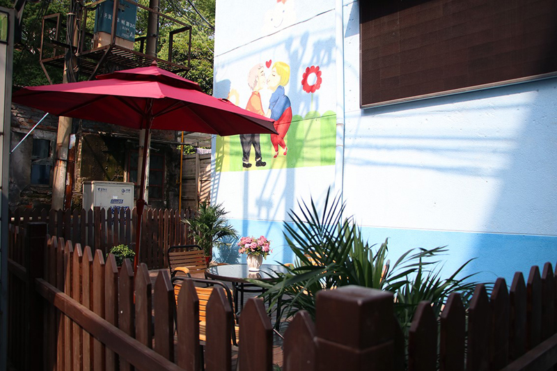 外墻設(shè)計以明度適中的天空藍為主色調(diào),室外活動場地進行全面提質(zhì)改造,設(shè)戶外花園約50平方米,布置綠化,安置桌椅、遮陽傘,保證老人戶外活動的需求,為老人提供私密、安全的用來休息交談或澆花養(yǎng)草的休閑場所。