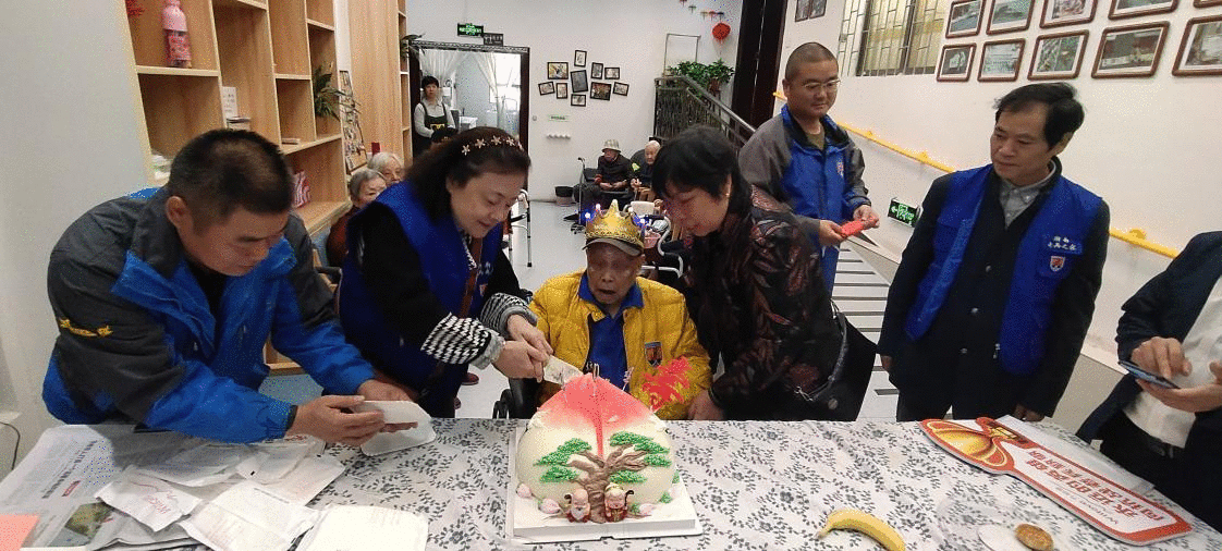與此同時(shí),湖南老兵之家的志愿者們提著大壽桃狀的蛋糕,來到了爺爺房間!一起為爺爺唱生日歌、吃蛋糕,其樂融融,每個(gè)人的臉上都露出了開心的笑容,一個(gè)接一個(gè)和我們的壽星百歲爺爺合照沾喜氣!正是因?yàn)橛邢窭罱B杰爺爺這樣的老兵為我們幸福平安的生活做出了巨大貢獻(xiàn),我們才能生活得如此安定。我們不會(huì)也不該忘記他們曾經(jīng)遭受過的苦難,我們希望他們能在銀海倆寶貝幸福、安詳?shù)亩冗^晚年!祝爺爺健康長壽!