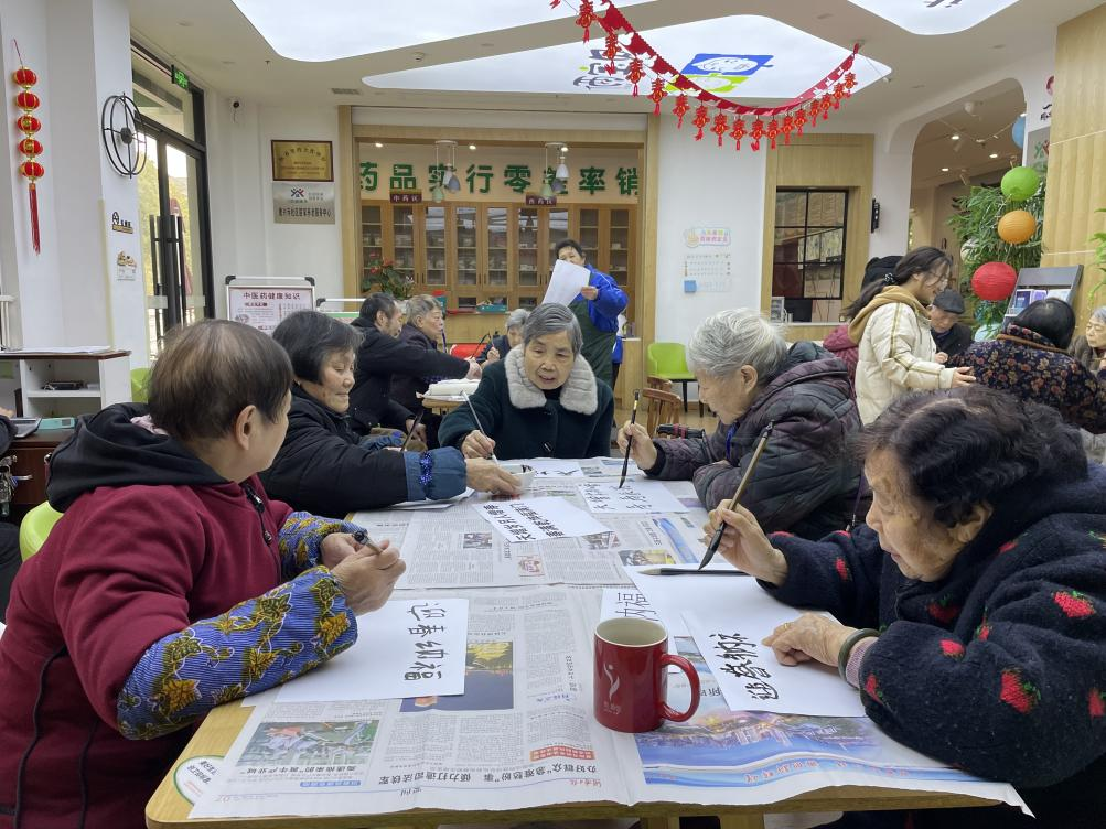 活動中,在工作人員的協(xié)助下爺爺奶奶們熱情高漲,先是提筆練習(xí),然后埋頭揮毫,現(xiàn)場提筆蘸墨的、忙著晾曬的,濃濃的墨香里洋溢著新年的喜悅,整個(gè)活動室彌漫著濃濃的年味。