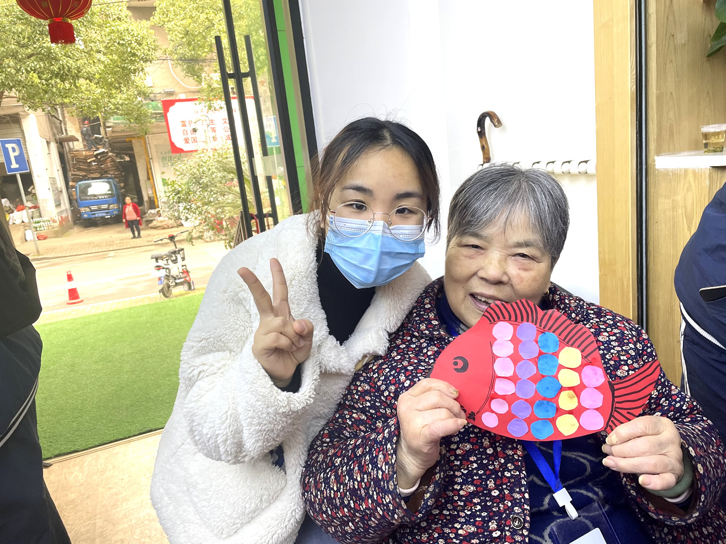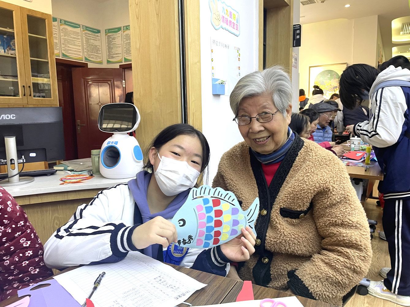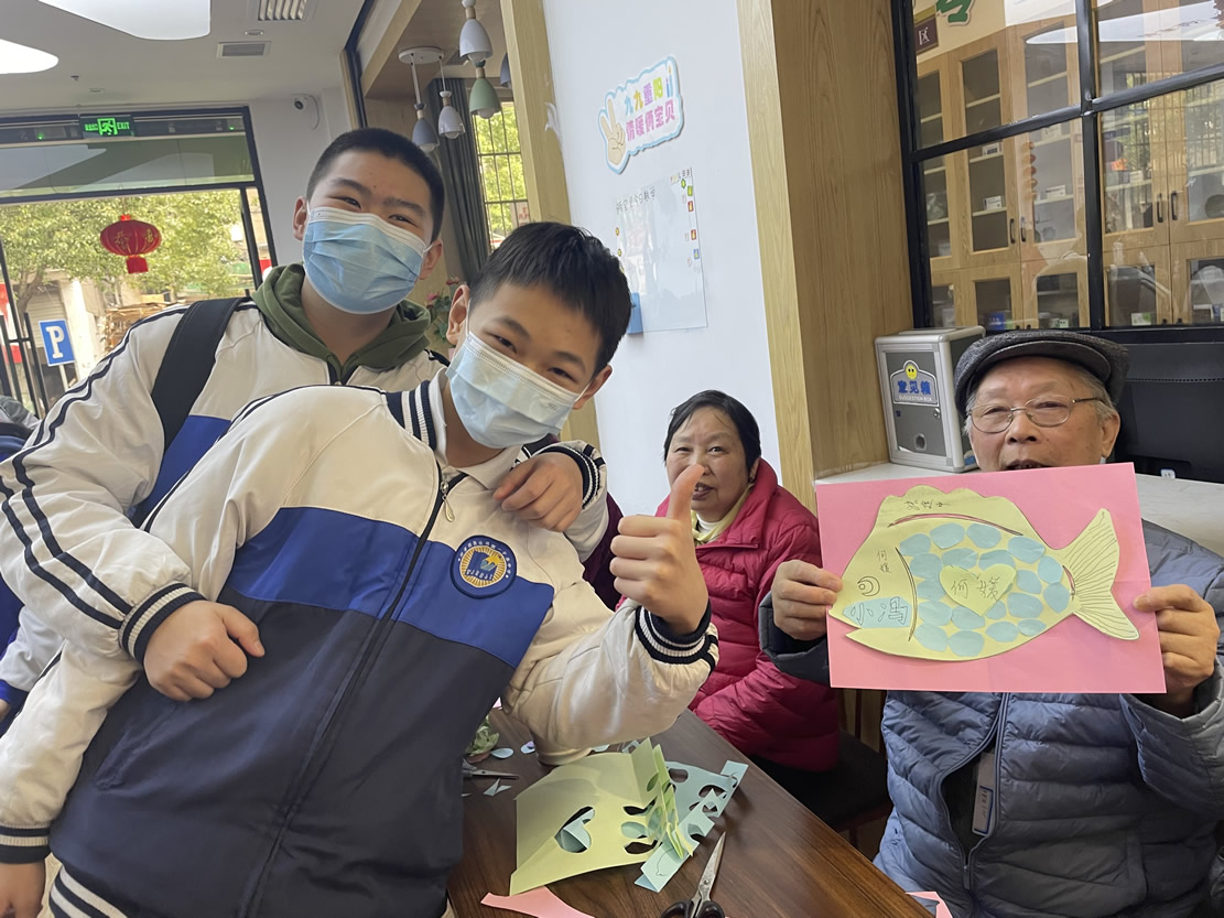“爺爺奶奶們好!”還未瞧見人一聲聲清脆響亮的問好聲便已傳了進(jìn)來,在老師及工作人員的組織下同學(xué)們有序進(jìn)入到院內(nèi)并配合做好疫情防控登記。不一會(huì)兒,同學(xué)們陸續(xù)找到爺爺奶奶進(jìn)行自我介紹,并以一對(duì)一的形式來協(xié)助他們完成今天的手工作品“年年有魚”。