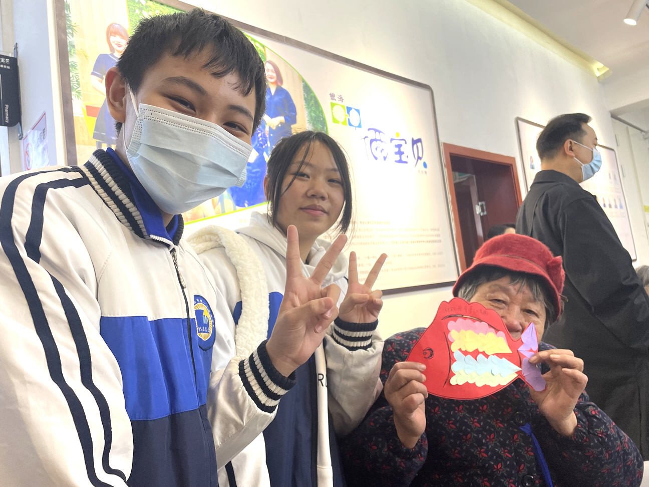 “爺爺,您喜歡這個(gè)顏色是嗎?下面我?guī)椭黄鸢阉舫鰜砗脝??”、“奶奶,您平常都有些什么愛好呀,可以跟我們說說您的故事嗎?”……只見同學(xué)們有的蹲坐在老人旁邊,有的則是伏耳于他們面前,耐心認(rèn)真地和爺爺奶奶們進(jìn)行交流,其他的人則是分工協(xié)作,完成“魚”的其他部位制作。不多久,一條條色彩斑斕,創(chuàng)意十足的“魚”就做好啦!爺爺奶奶們拿著完成的作品分別和自己的“小伙伴”們合影留念,再次感謝他們的到來!